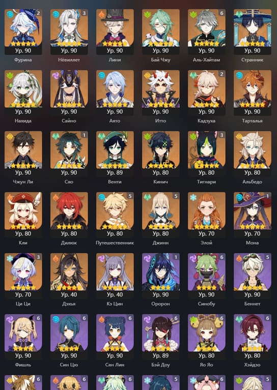 📈 Ранг: 60 🧍♀️ Персонажи: Дилюк, Ху Тао, Мона, Аяка, Е Лань, Чжун Ли, Тарталья, Ёимия, Тигнари, Ци Ци и другие ✨ Примогемы: 6150