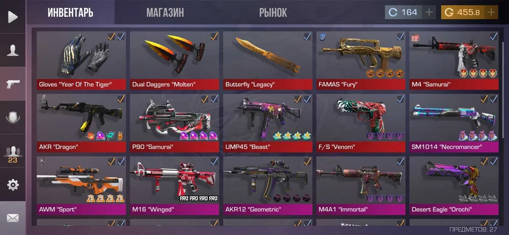 💰Голда: 27.02; 🧤Перчатки: "Hanami"; 🔪Ножи: Kunai "Wavesong", jKommando "Plasma" ⭐️Редкие скины: 4